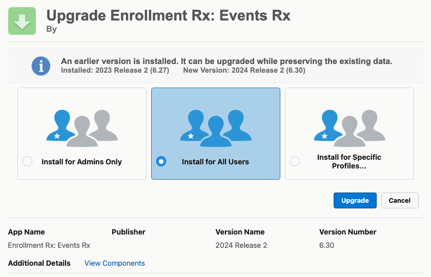 If you have been given a URL for installing or upgrading Events Rx, you can install either into your production org or a sandbox org by slightly altering the URL.