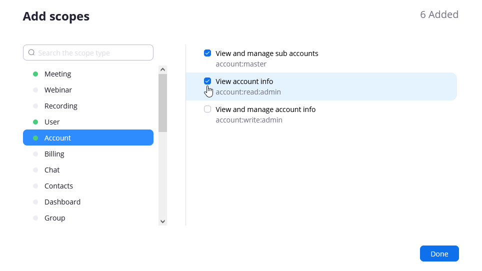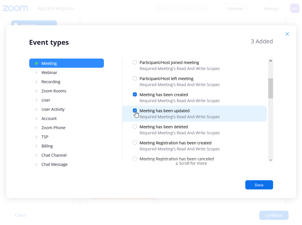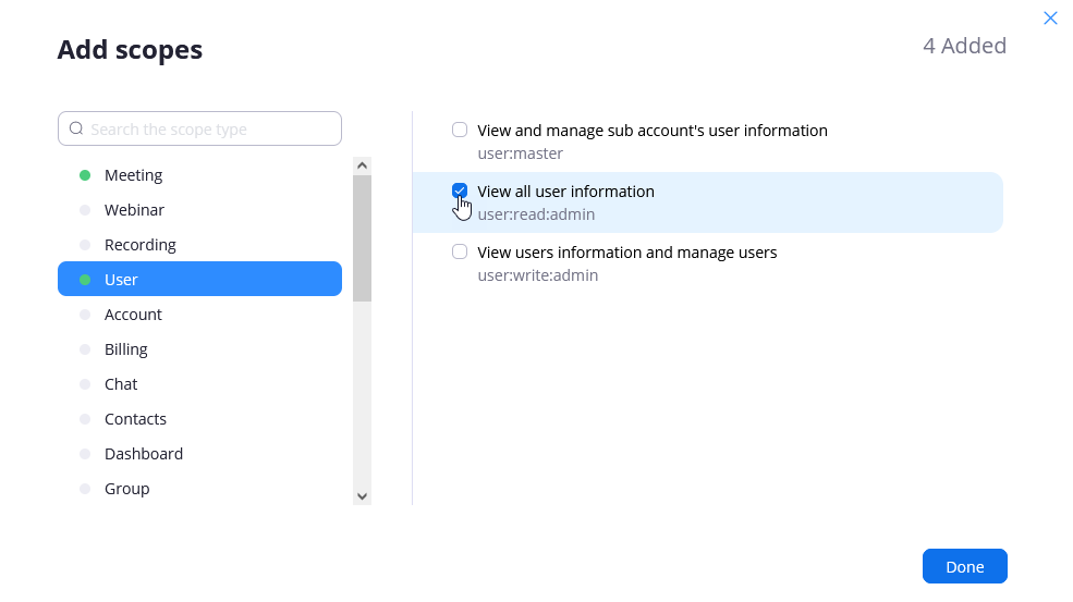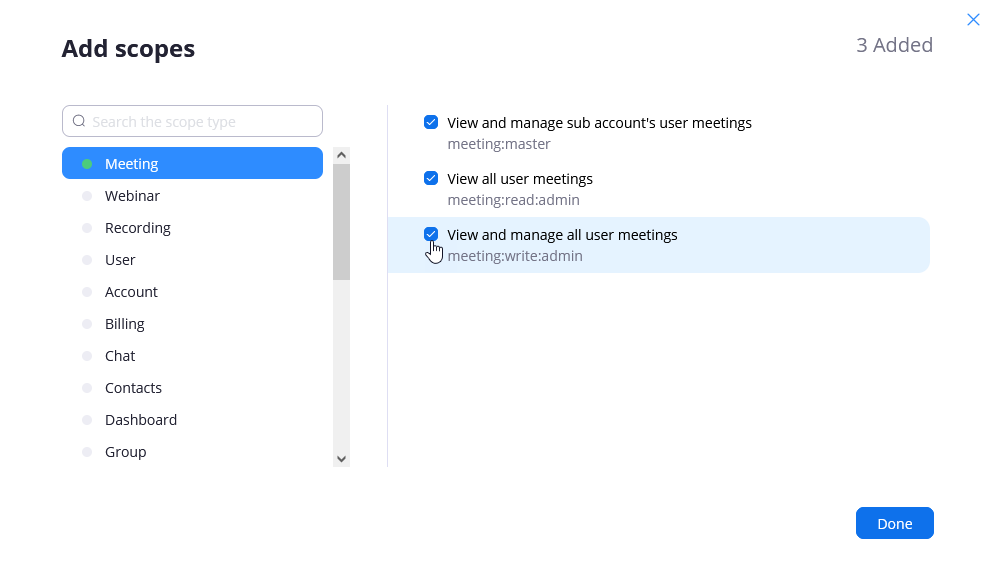 - In the Add Scopes Dialog in the Meeting section, select all three