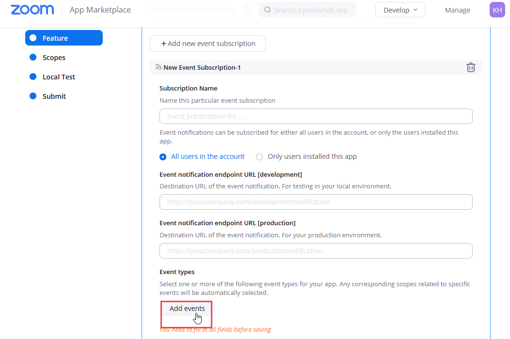 - Turn on the Event Subscriptions toggle and then click the Add new event