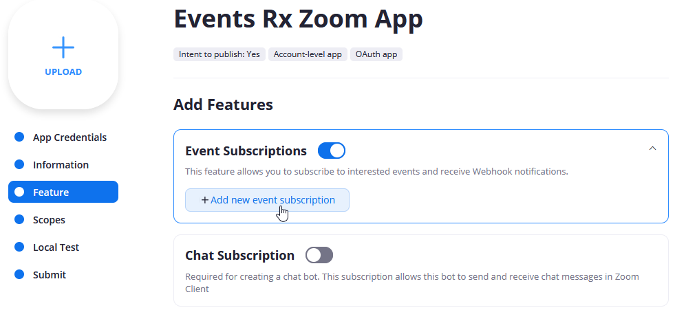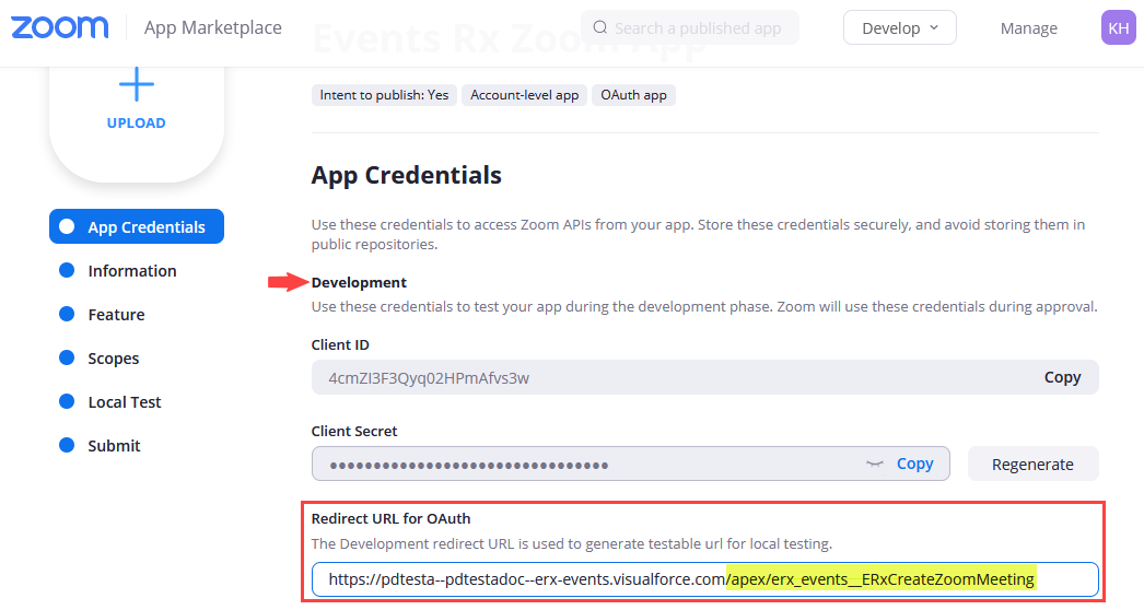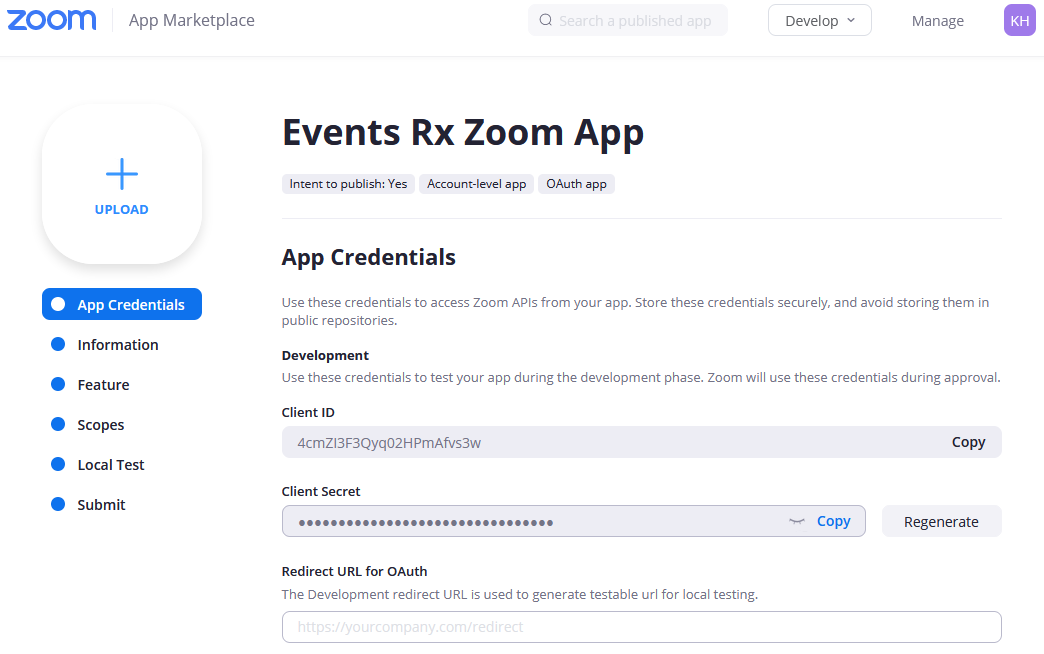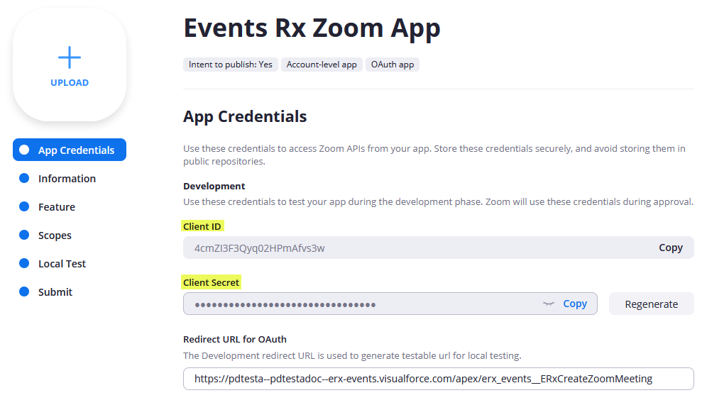 After you're done entering the Zoom Client ID and Client Secret in Events Rx, return to the Zoom App Credentials page.