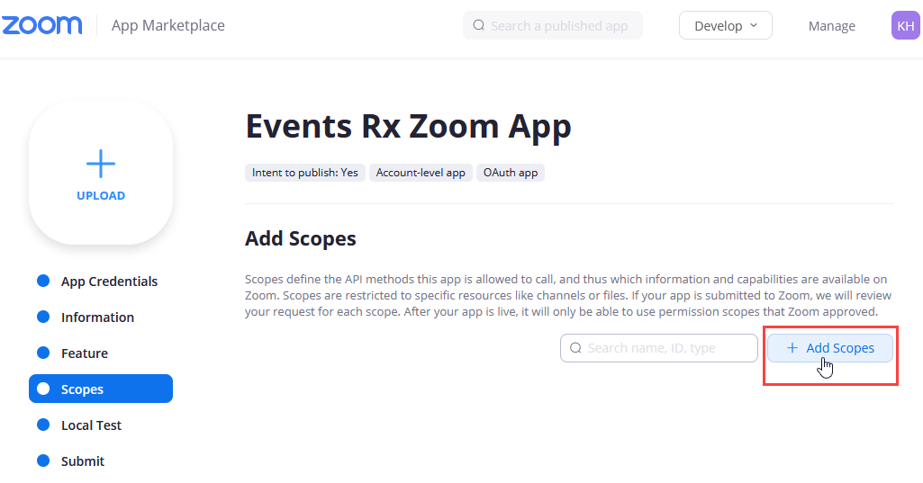 - On the Scopes page, click the Add Scopes button.