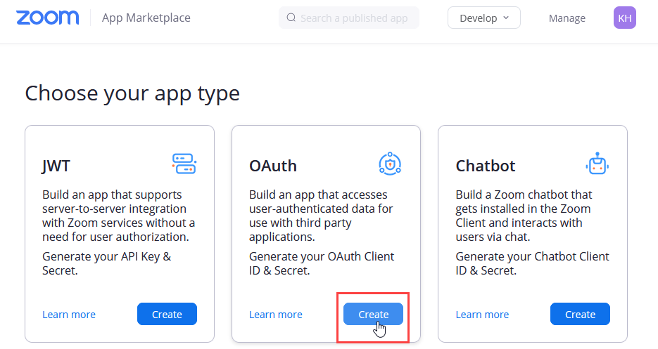 - Head over to the Zoom App Marketplace, where you will create and configure the OAuth app.