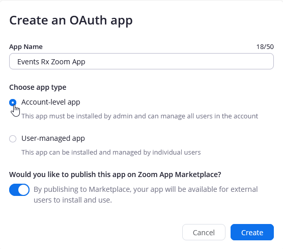 Tip:To enable this functionality for multiple Zoom users, select the User-managed app option instead. - Click Create. This will take you to your app's main page and settings.