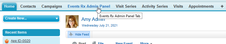 already logged in), navigate to Events Rx, and click the Home tab. In the