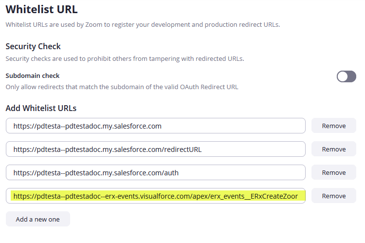 Note:The first portion of your URL, up to and including visualforce.com, is unique to your org and will be different from the above example. The appended portion,/apex/erx_events__ERxCreateZoomMeeting, is boilerplate and can be copied and pasted. - Next, you will add four different URLs to the fields under Add Whitelist