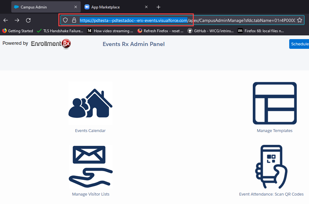- From the Events Rx Admin Panel page, go to the browser address bar and copy