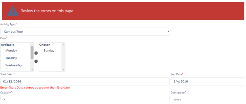 You will receive an error if you enter a start date greater than End date.