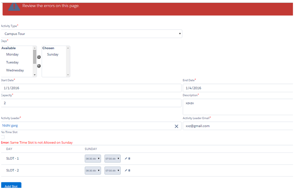 You will receive an error if you enter same timeslots twice.
