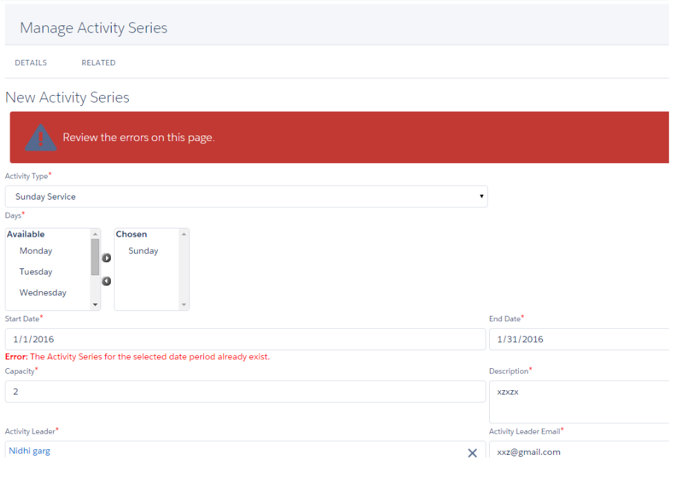 You will receive an error if a duplicate Activity Series for same time period cannot be created.