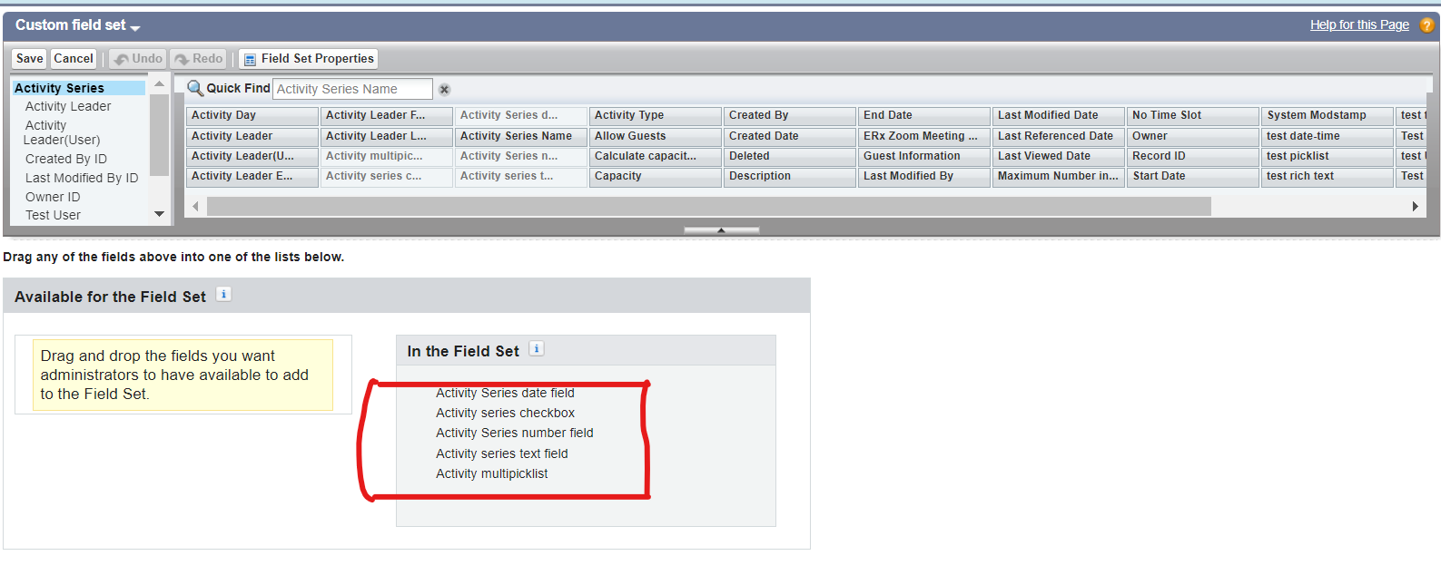 - Create a custom fieldset on the Activity Series Object (e.g., "Custom Field Set")