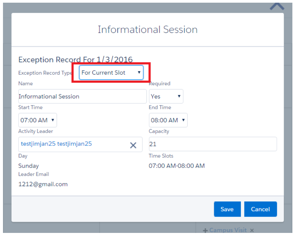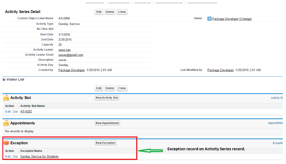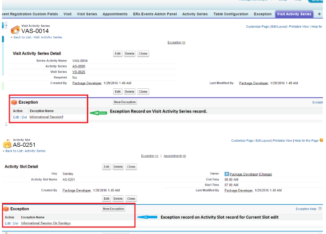 The Exception record (created from the “For Current Slot” option) can also be viewed on the Visit Activity Series record and the Activity Slot record at the backend.