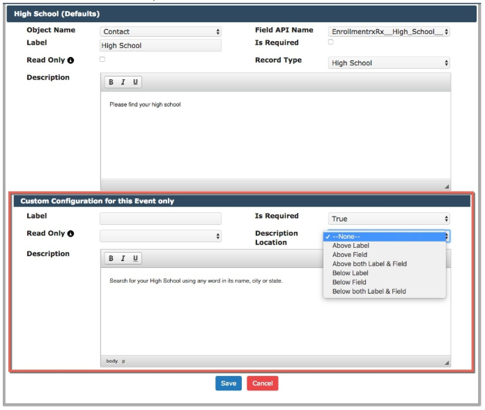 Campaign specific changes can be made to a field by adding it to the layout then double clicking on the label. This allows for changes to this campaign only, including: