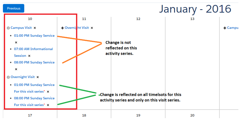 The “For This Visit Series” option creates an exception for all occurrences of the Activity Series that are related to the current Visit Series.