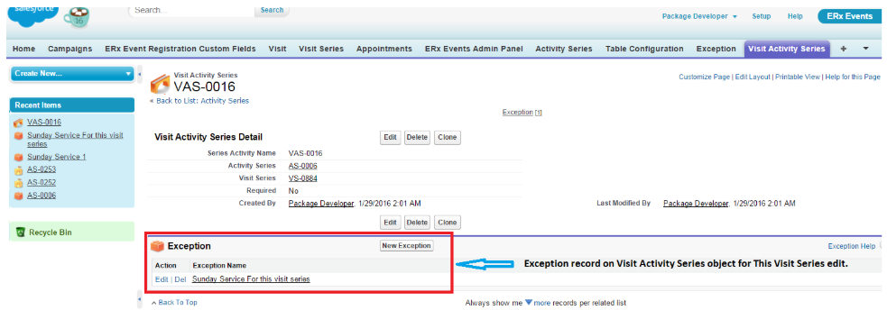 The exception record created by using the “For This Visit Series” option can also be viewed on the Visit Activity Series record.