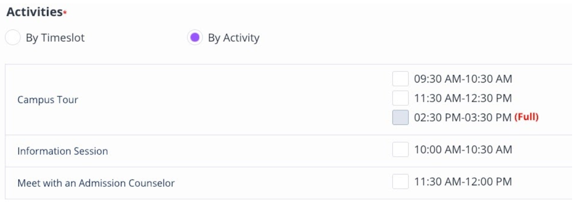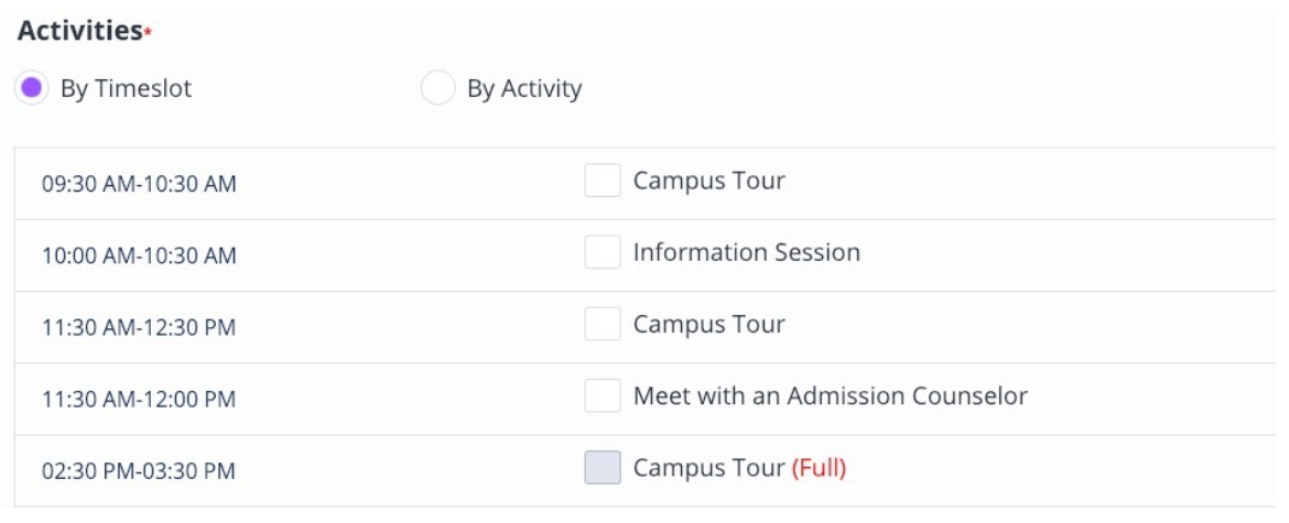 - Registration for two activities for which time slots overlap is not allowed. When the user clicks the second one, the first one becomes unchecked.