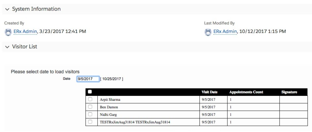 Go to a Visit Series record after table configuration has been created. You will see the resulting table in the “Visitor List” section as illustrated here. You select a date and the table appears listing visitors registered for the visit series on that date.