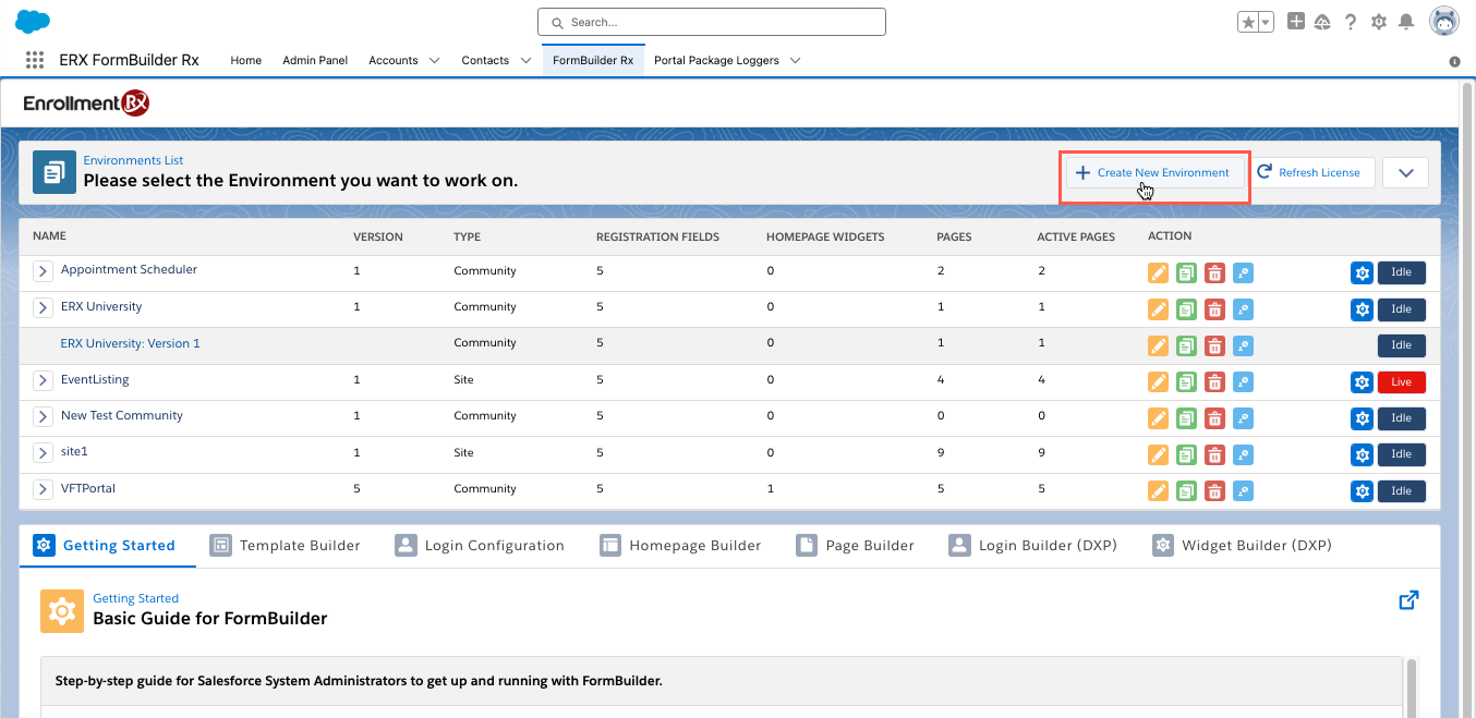 Navigate to the FormBuilder Rx tab and click the Create New Environment button in the top