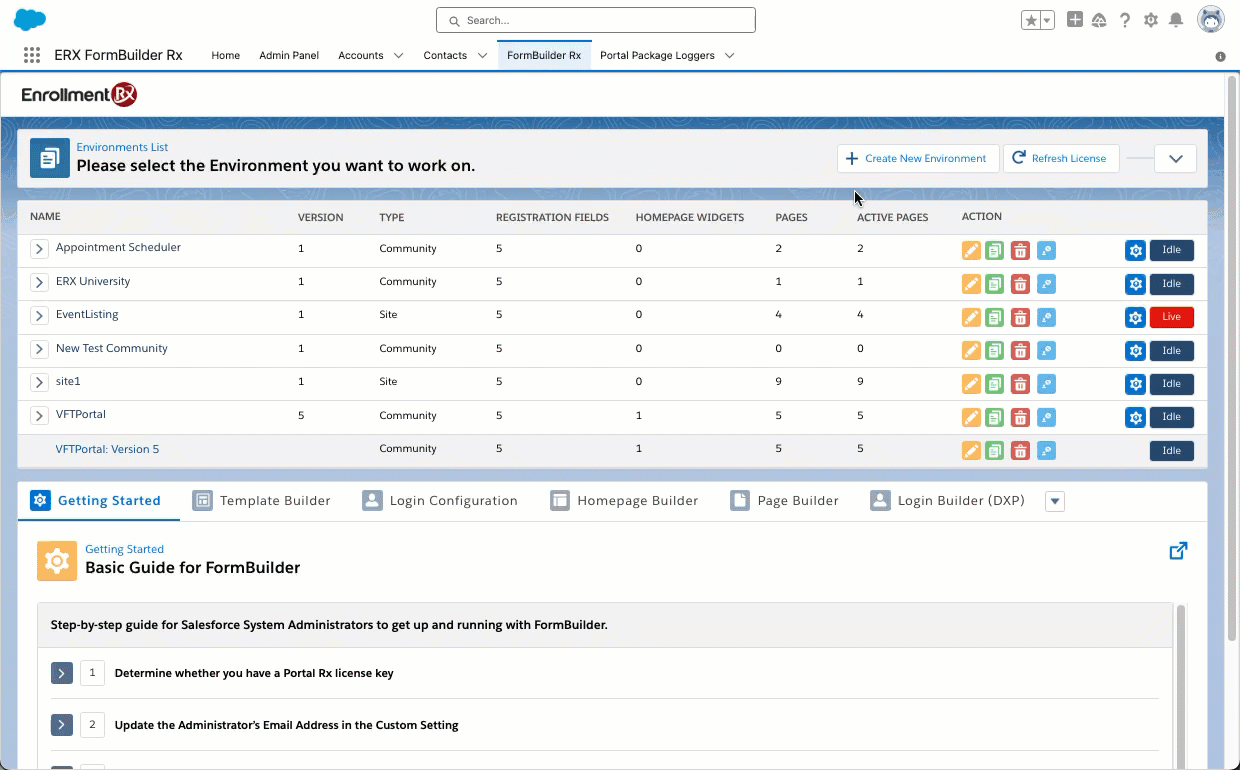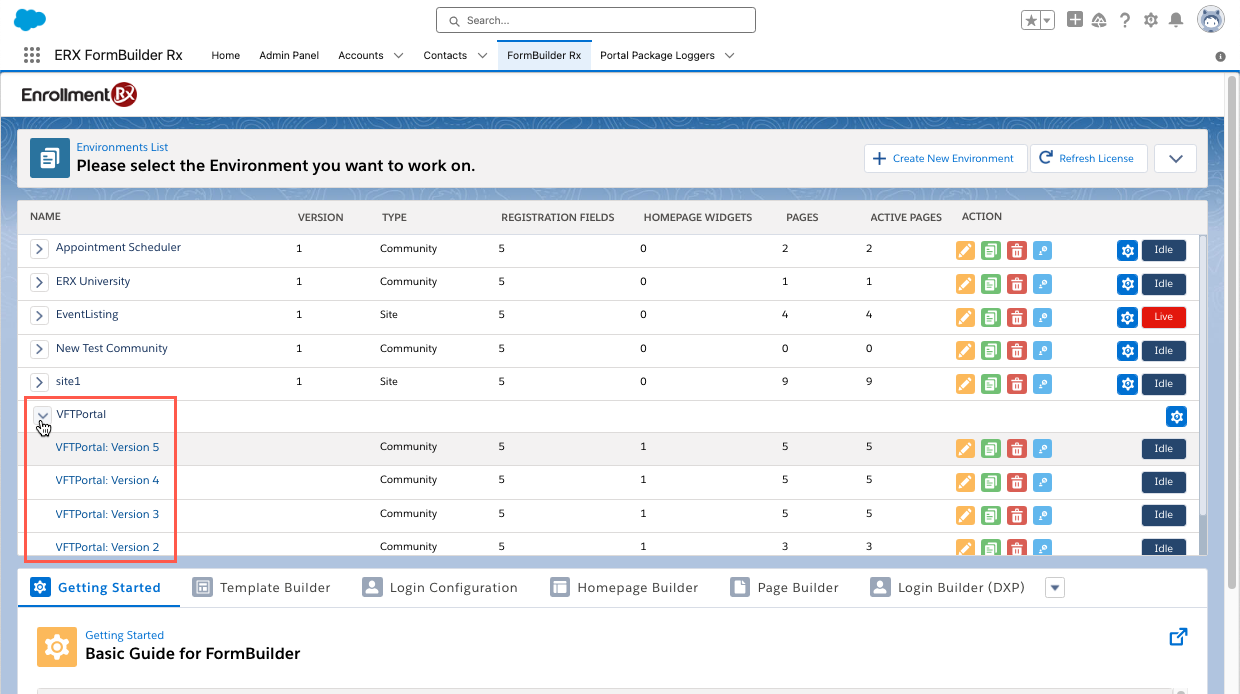Because FormBuilder Rx eliminates the need to write custom Apex and VisualForce code, it also removes the need for initial development to be done in a sandbox org. For this purpose, it provides the ability to manage multiple versions (configurations) of an Environment. For a given Environment, only one version can be Live and available for your external community users. Other versions can be either in Test mode or Idle.