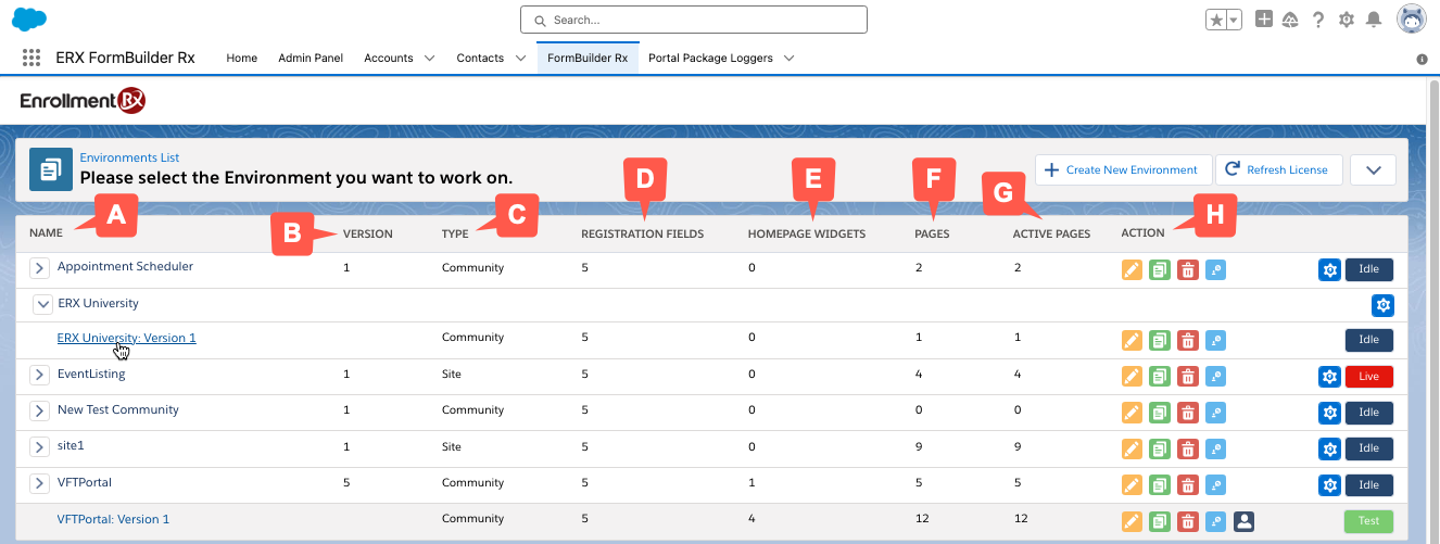 - Action — Buttons to edit, create new versions of an Environment, delete, translate, set up permissions, and change status (e.g., Idle, Test, or Live).
