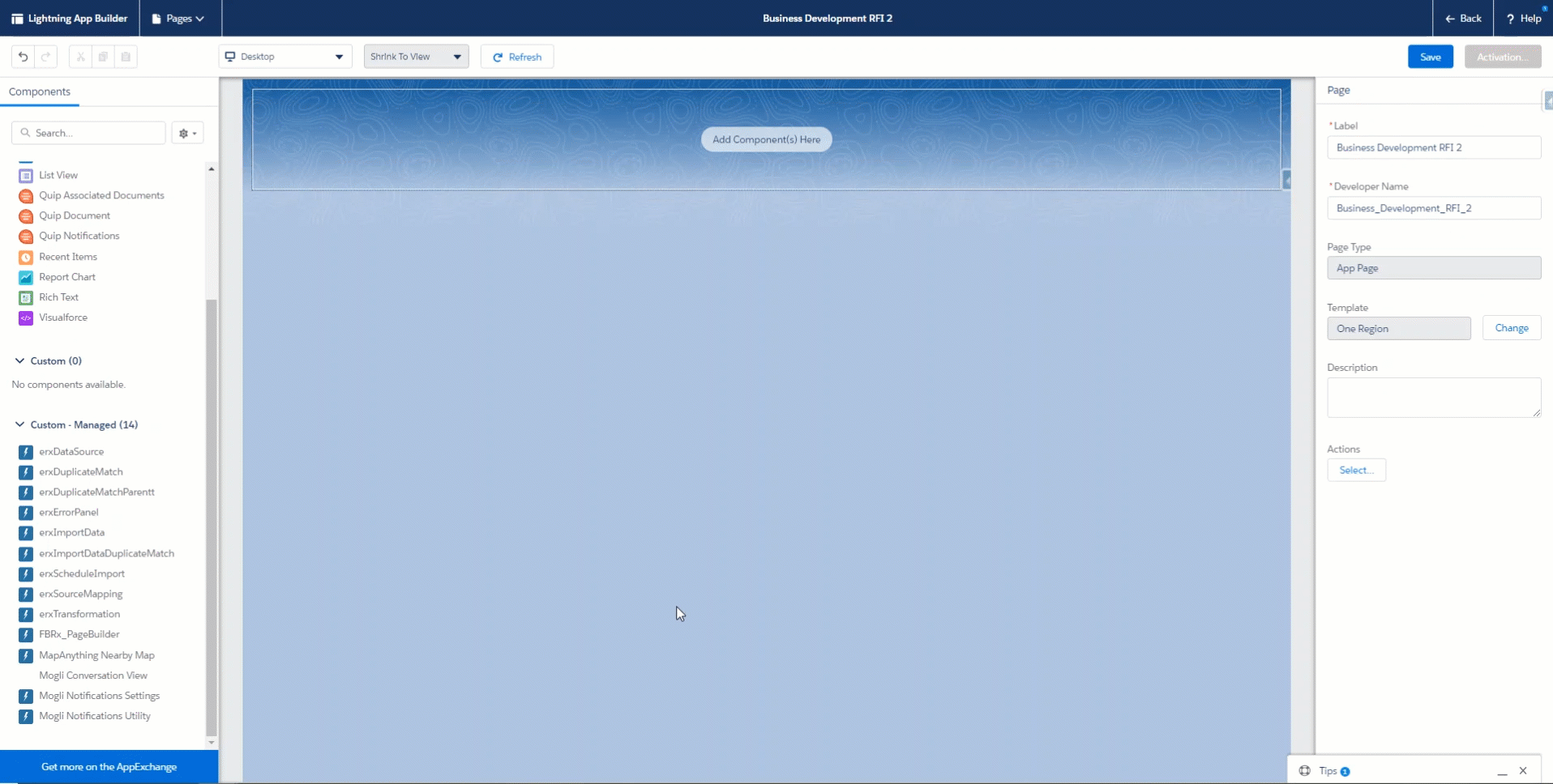 Navigate to the Custom Lightning Components, and drag FBRx_PageBuilder to the page.