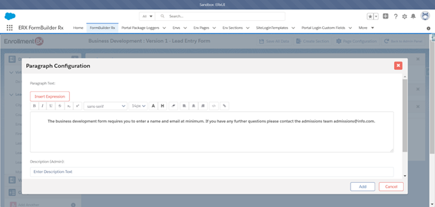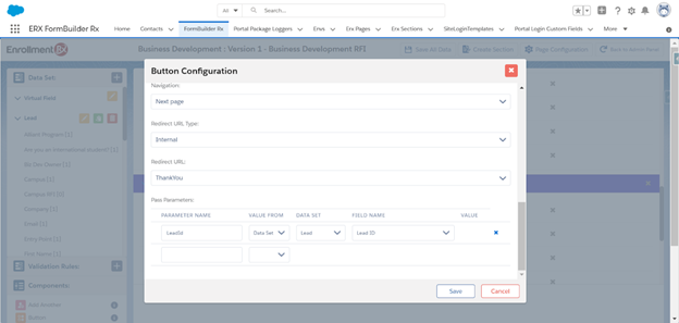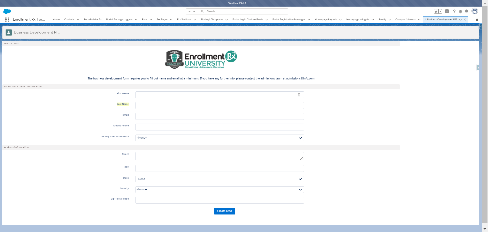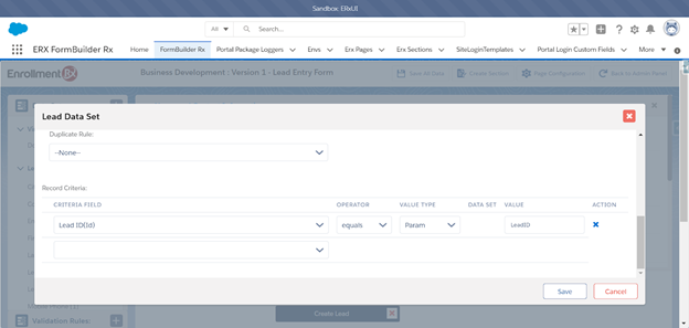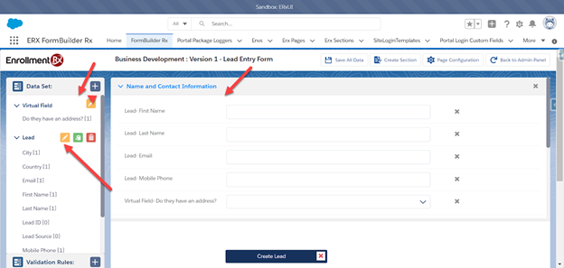 This process allows the example business development team to add leads directly and take advantage of FormBuilder Rx functionality.