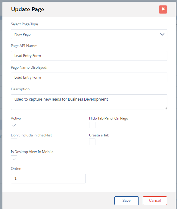 Click the Create New Page button on the Page Builder tab and set up the page you would like to host internally. For the page settings, create a new page, order and name (as shown below). Please note that the order will dictate which page will show up first.