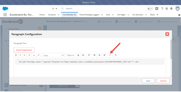 By clicking the </> button, you can insert HTML into your paragraph to reference an image, and that can be to an internal static resource or external URL. You can use this HTML as a template to insert your image: