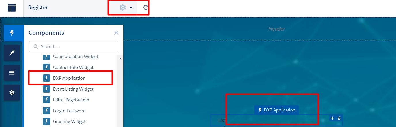 - Go to the Components section and drag and drop the “DXP Application” component to registration page