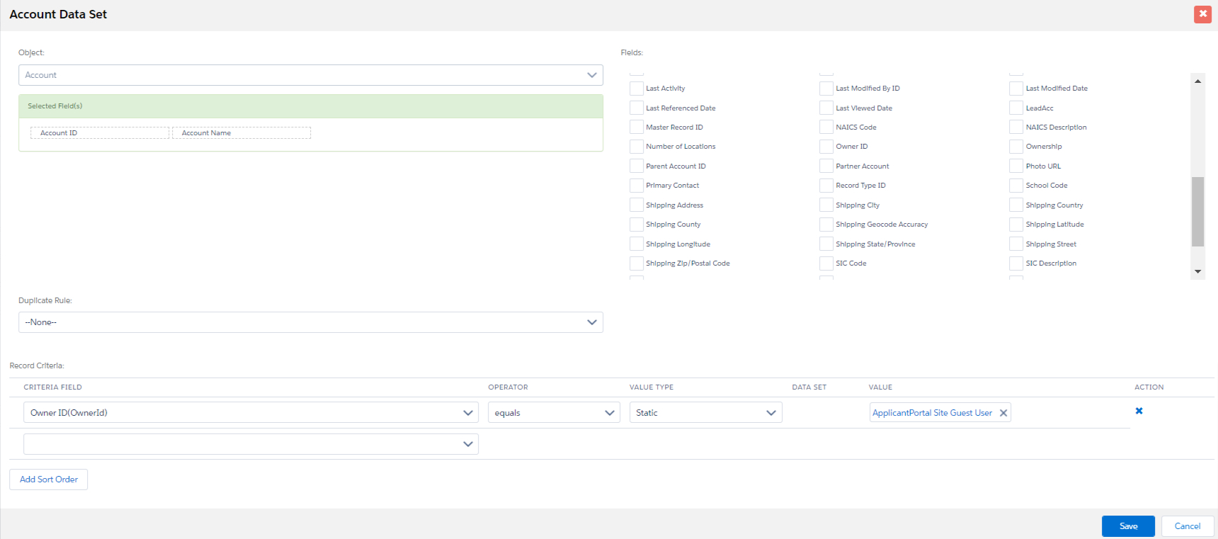 - Create a Data Set for Contact and Account (Account map owner id = Site Guest