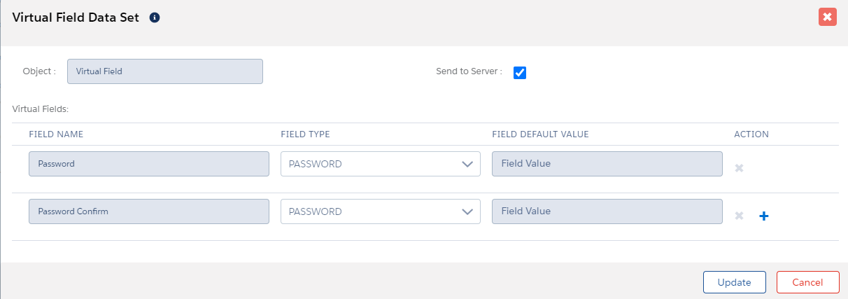 - Create two virtual fields called Password and Password Confirm (Type =