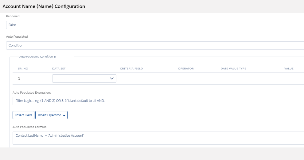 auto populated put formula :- Contact.LastName + 'Administrative Account'