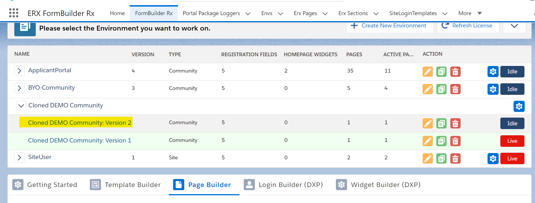 - The FormBuilder Rx Environment for your Community is now ready to go live. Important:Before setting a new version of a FormBuilder Rx Environment for a Community to Live, there are some steps required in Experience Builder to fully implement a new version. We recommend holding off on step 6 (below) until you are ready to perform the final step from the “Prepare a Digital Experience Community to go Live with a New FormBuilder Rx Environment” section that follows.