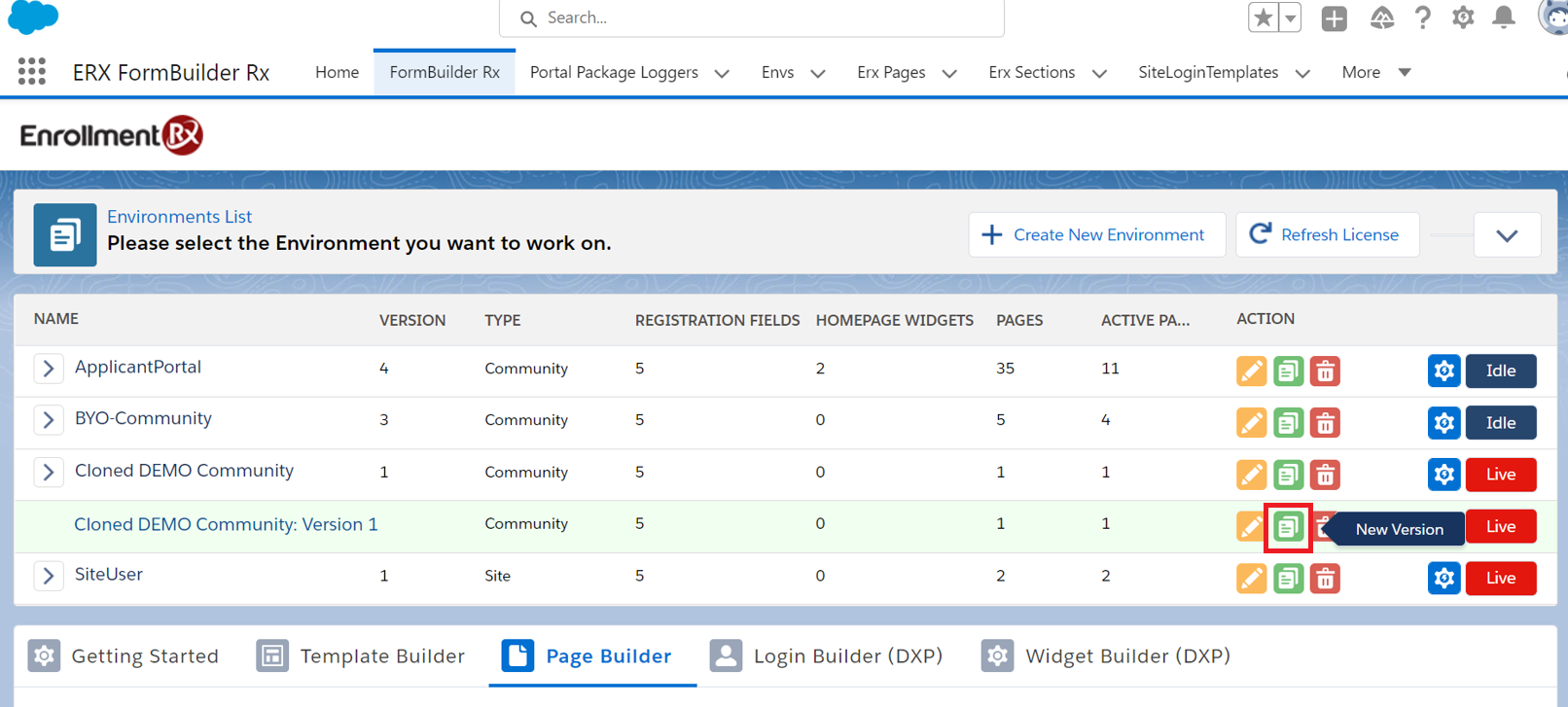 - Creating a new version of a FormBuilder Rx Community Environment.