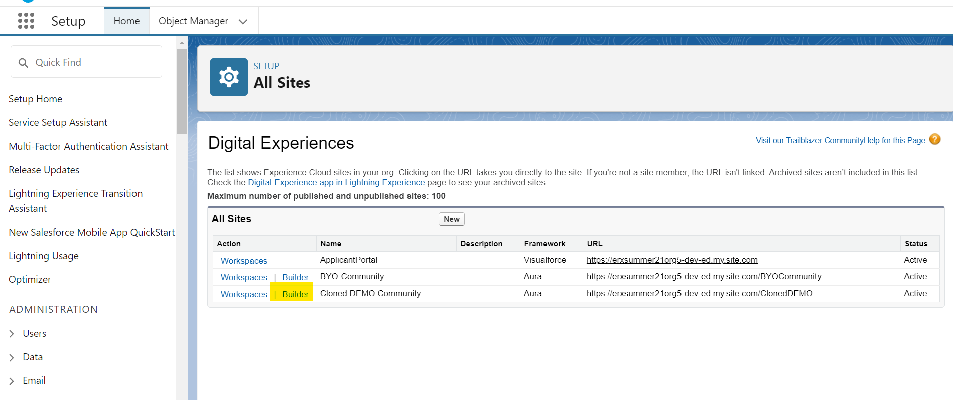 - In Salesforce, click and search for "Digital Experiences" in the Quick Find box. Click on "All Sites" when it appears.