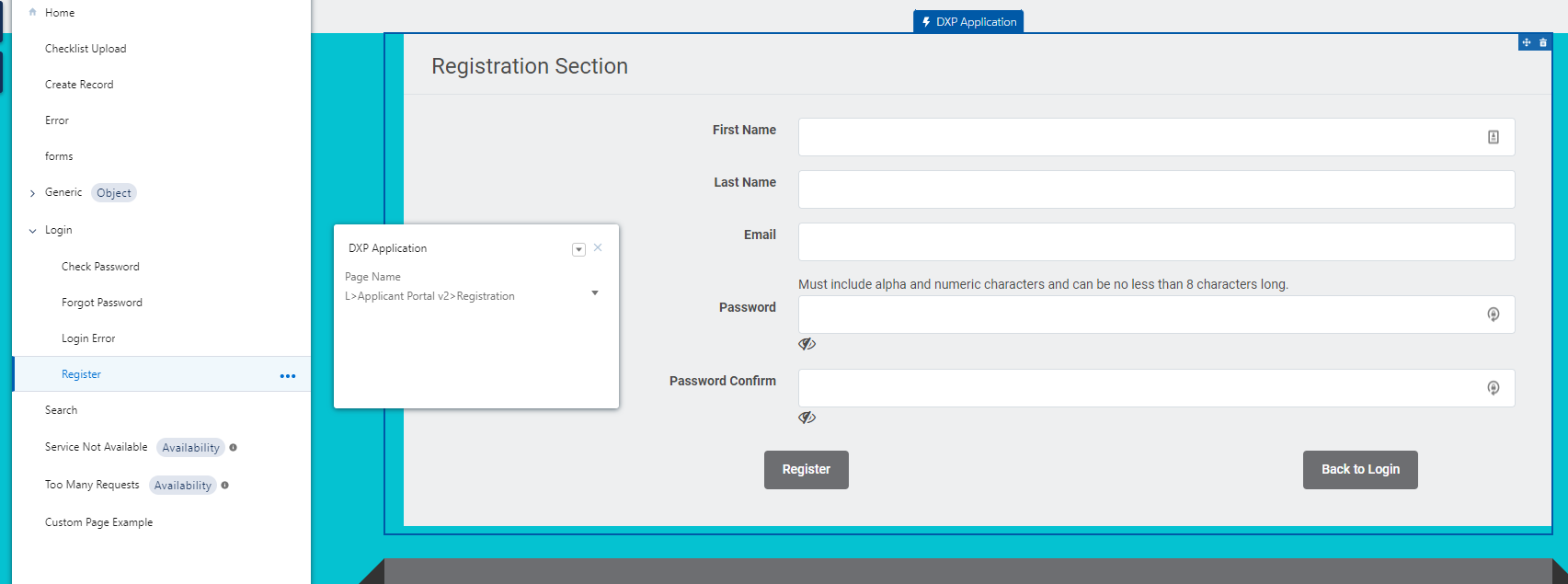 Note:This update will need to occur for all DXP components that reference a FormBuilder Rx widget or page. A complete list of DXP components is available below. - Update the DXP Component on the Registration page. This page can be found nested