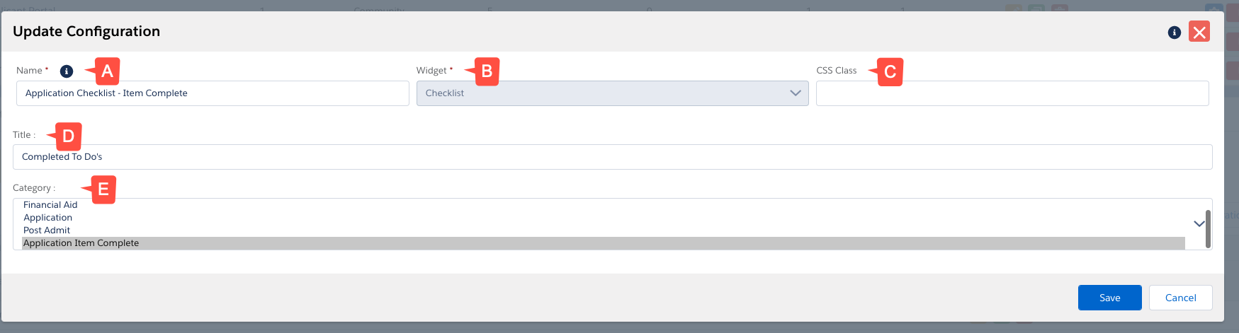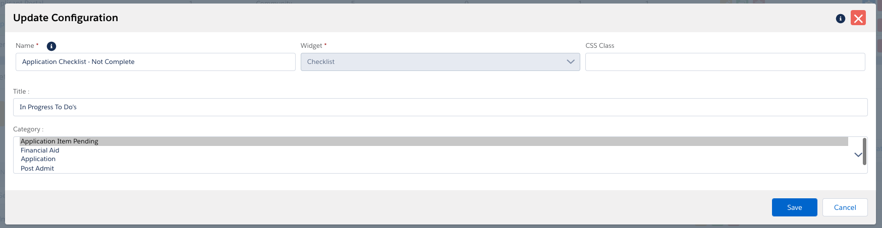 If you would like to display two different Checklist Widgets on the same page (e.g., one to control a Portal User's in-progress items and one to control their completed items), create two separate Category labels in ERX Core. For example, you could configure the Category field to have values of “Application Item Pending” and “Application Item Complete” to define which items will display in which checklist.