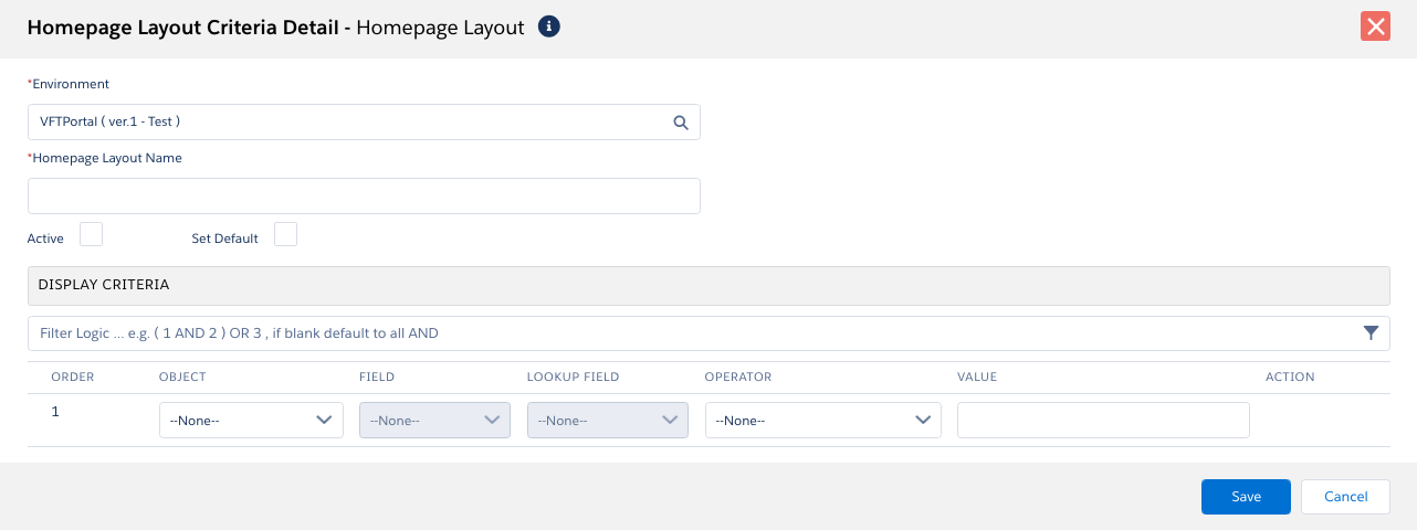 - Check Set Default to make the layout the default layout, meaning that it will be displayed if no other layout’s Display Criteria are satisfied. (Checking this removes the Display Criteria from the dialog.)