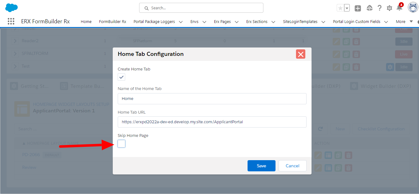 Note:This option is unchecked by default - Checking this checkbox dynamically displays a picklist with all of the pages for your selected environment. The page you select will be the home page