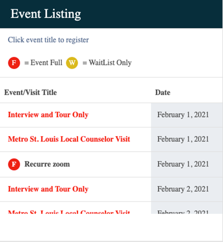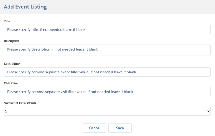 If you have Events Rx, see the Events Rx User Guide section Constructing a URL that Filters the EventsListing to configure the Event Filter and Visit Filter.