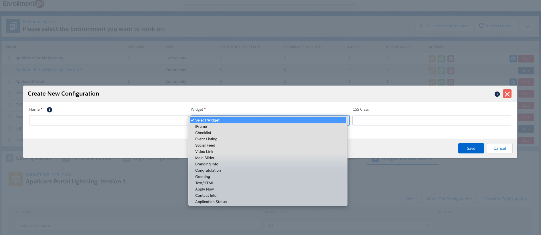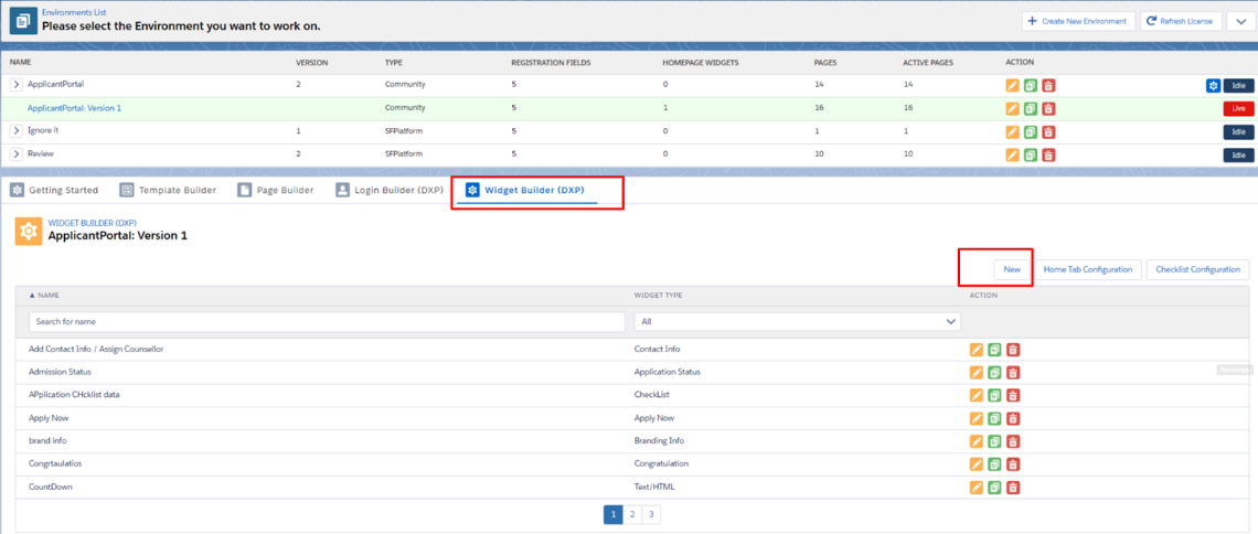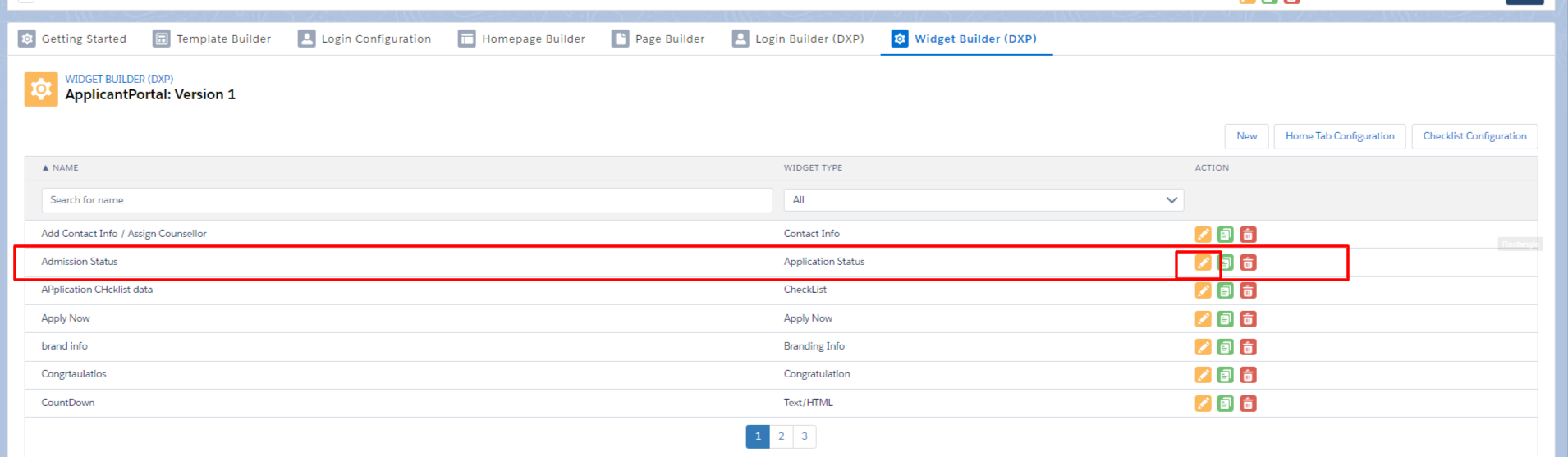 In Homepage configuration, you'll need to create all records related to the homepage using a Widget (for example, Application Status, Social Feed, Apply Now, Contact Info, iFrame, VIdeo, Greeting, etc.). Follow these steps: