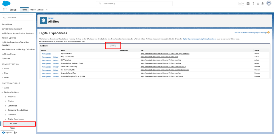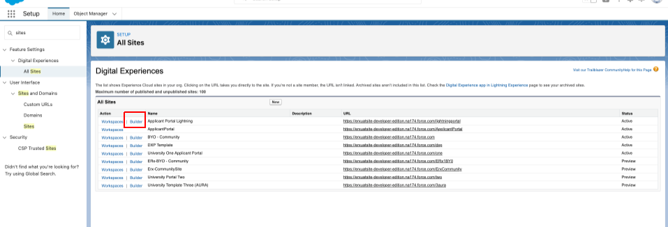 - Go to Setup, search "All Sites" and click on the Builder button on the Community