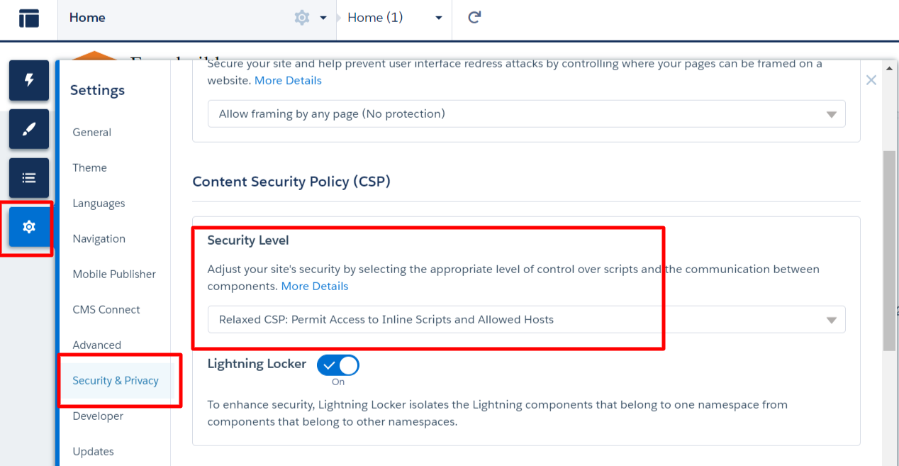 - Change the security level to "Relaxed CSP":
