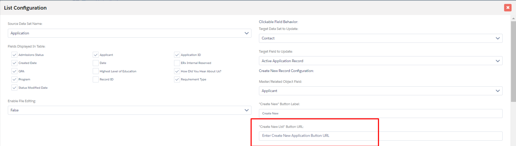 the list component for the “Create New List Button URL” with a new URL.