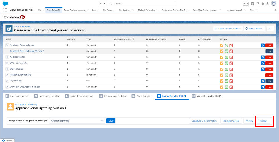 - Go to Login Builder (DXP) and click on the Message button.