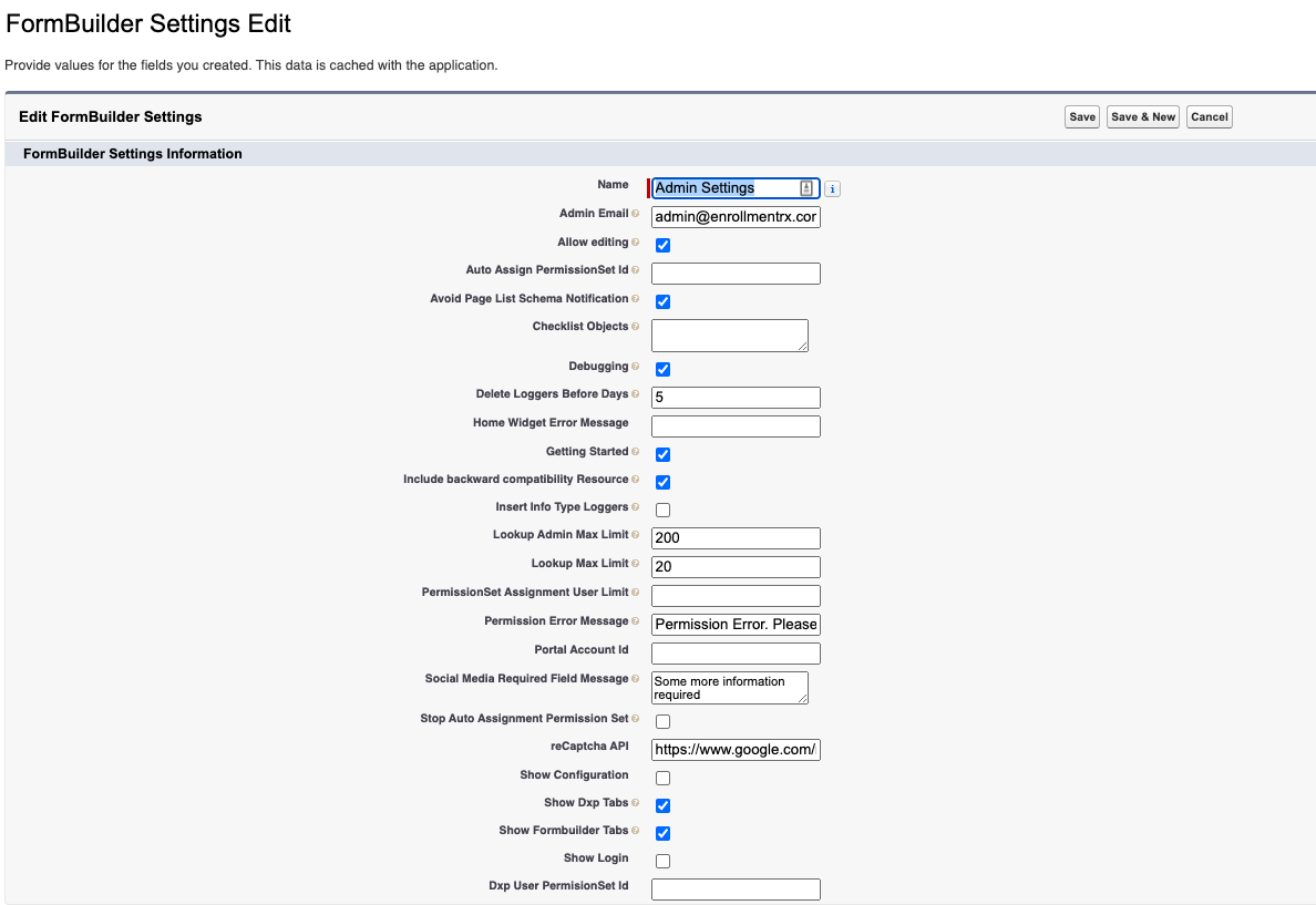 To enable DXP configurations for the FormBuilder Admin Panel, you'll need to update the FormBuilder Rx custom setting using below steps: