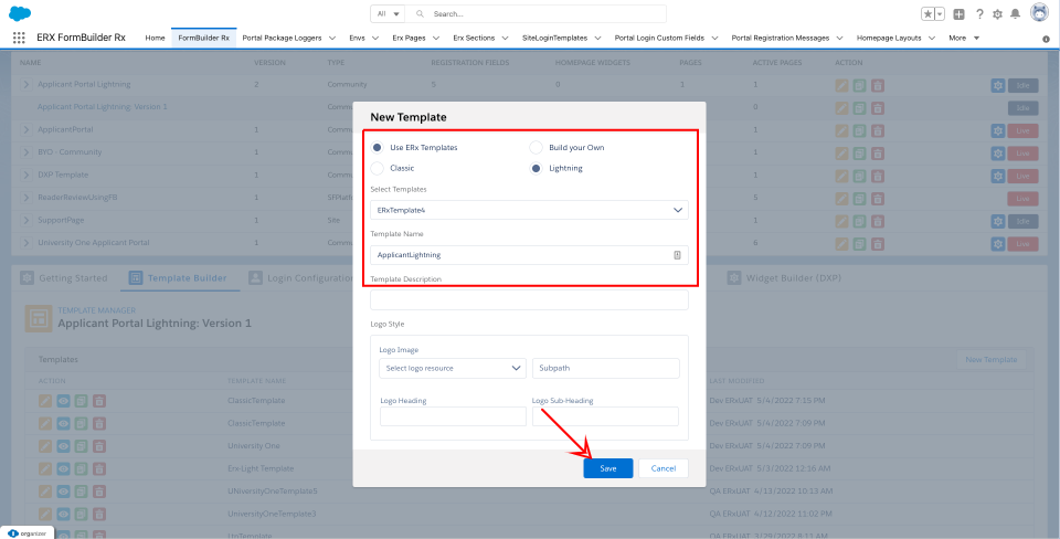 - Next, select ERX Template, choose the “Lightning” radio button, select the