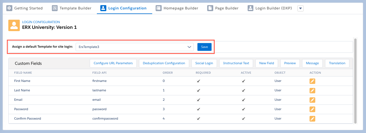 In the dropdown at the top of the Login Configuration tab, choose the template for the