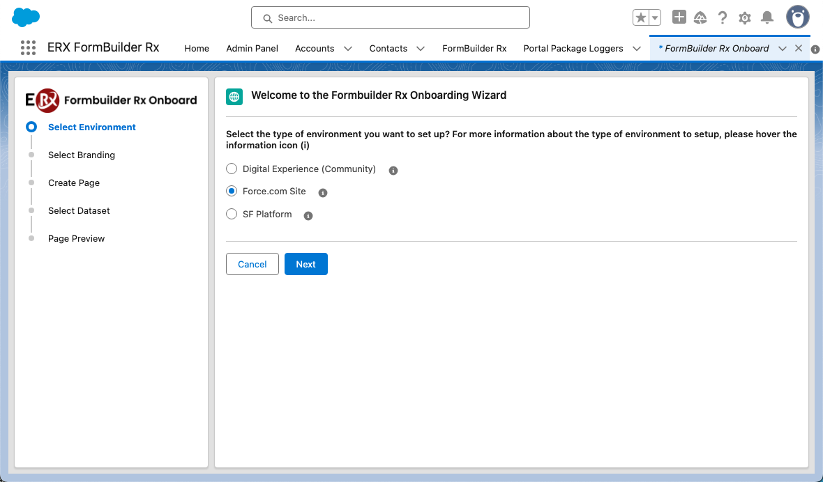 - You'll be redirected to the Onboarding Wizard to select an environment type.