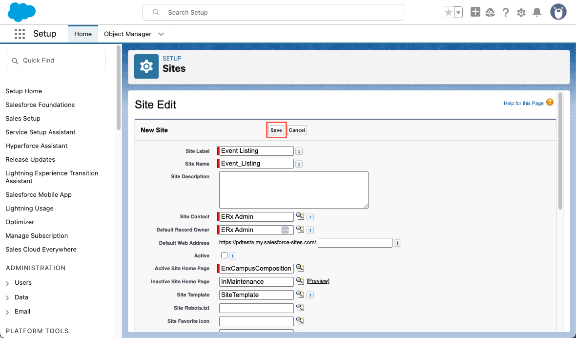 - After selecting Create New, you'll be redirected to the Site Edit page in (this will open in a new tab). Fill in the details and