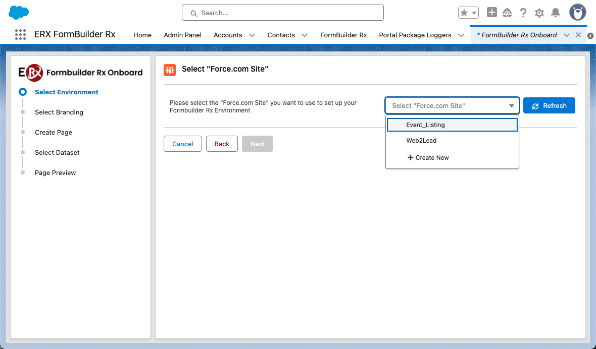 - Create a new Force.com Site by selecting Create New from the dropdown list.